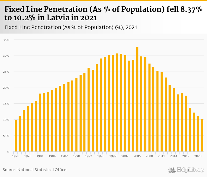 Fixed line penetration as a percentage of population fell 8.37% to 10.2% in Latvia in 2021, according to World Bank.
