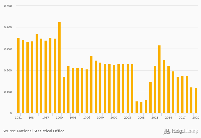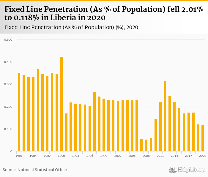 Historically, fixed line penetration as a percentage of population in Liberia reached an all time high of 0.422% in 1990 and an all time low of 0.052% in 2008.