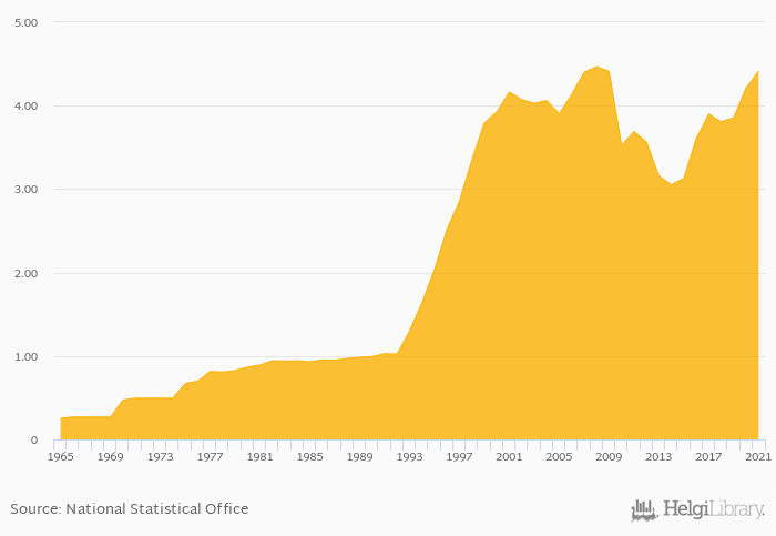 Fixed line penetration as a percentage of population rose 4.70% to 4.42% in Philippines in 2021, according to World Bank.