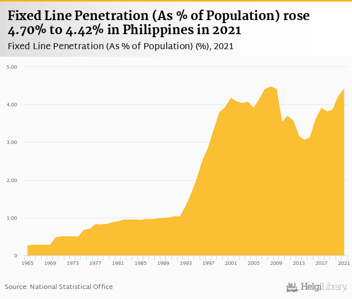 Fixed line penetration as a percentage of population rose 4.70% to 4.42% in Philippines in 2021, according to World Bank.