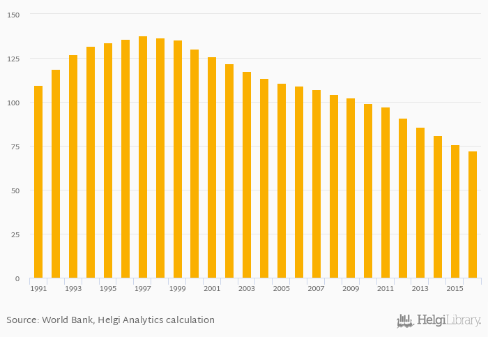 Fixed lines per household fell 4.55% to 72.4% in Macao in 2016, according to World Bank.
