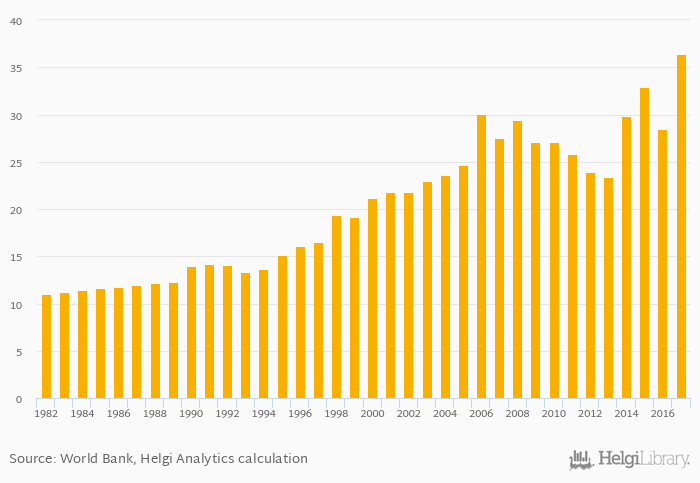 Historically, fixed lines per household in Mongolia reached an all time high of 36.4% in 2017 and an all time low of 11.0% in 1982. When compared to Mongolia's main peers, fixed lines per household in China amounted to 40.3%, 79.5% in Kazakhstan, 28.2% in Kyrgyzstan and 59.4% in Russia in 2017.