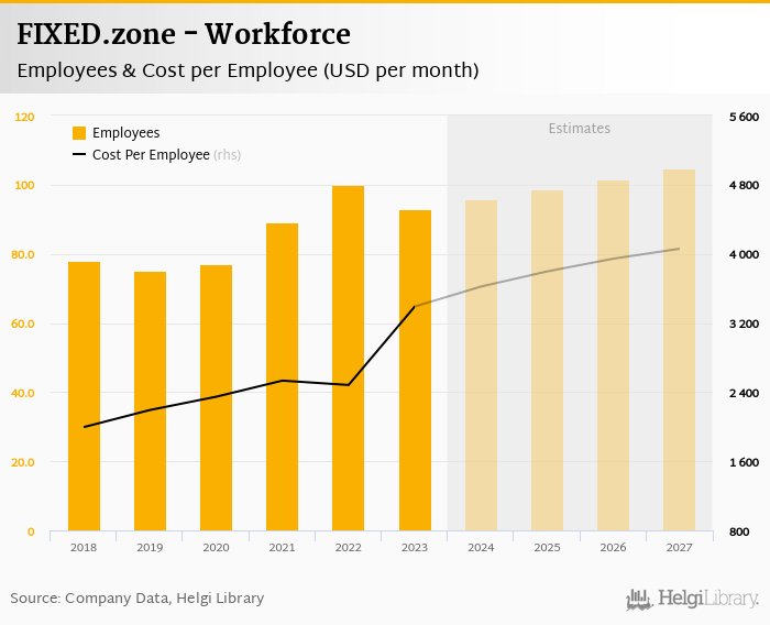 FIXED.zone employed 93.0 employees in 2023, down 7% compared to the previous year. Historically, between 2018 and 2023, the firm's workforce hit a high of 100 employees in 2022 and a low of 75.0 employees in 2019.