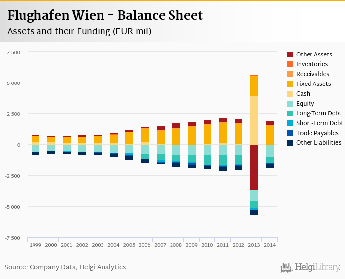 Flughafen Wien's total assets reached EUR 1,892 mil at the end of 2014, down 3.16% compared to the previous year.