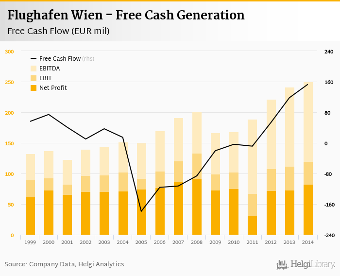 Flughafen Wien made a net profit of EUR 82.5 mil with revenues of EUR 646 mil in 2014, up by 12.5% and up by 0.079%, respectively, compared to the previous year. This translates into a net margin of 12.8%.