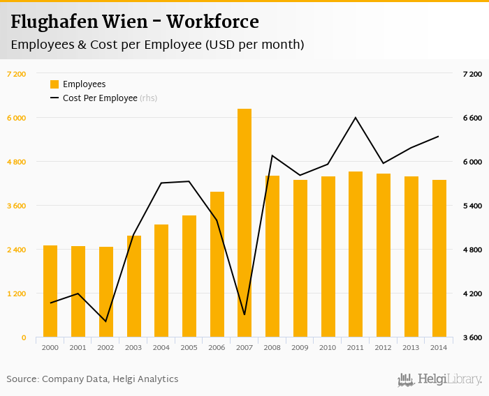 Flughafen Wien employed 4,306 employees in 2014, down 2.11% compared to the previous year. Historically, between 2000 and 2014, the firm's workforce hit a high of 6,242 employees in 2007 and a low of 2,479 employees in 2002.
