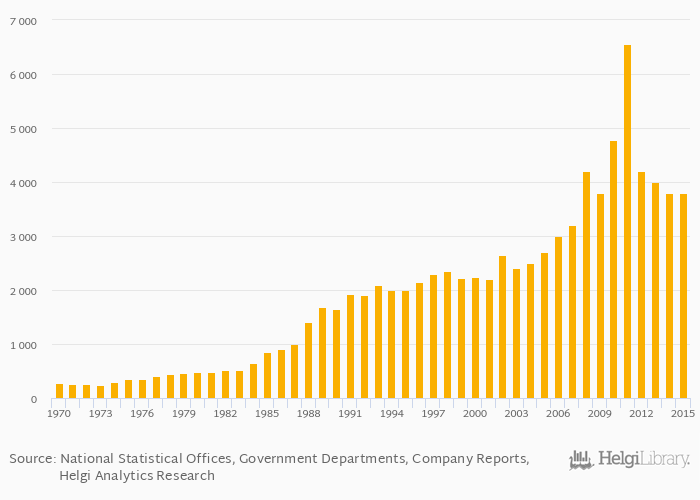 Historically, fluorspar production in China reached an all time high of 6,550 kt in 2011 and an all time low of 250 kt in 1973.