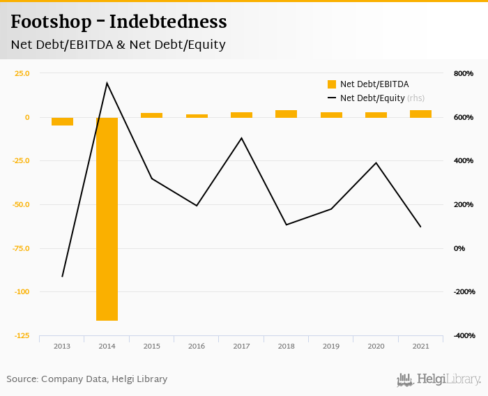 Footshop's net debt stood at CZK 59.1 mil and accounted for 94.9% of equity at the end of 2021. The ratio is down 295 pp compared to the previous year.