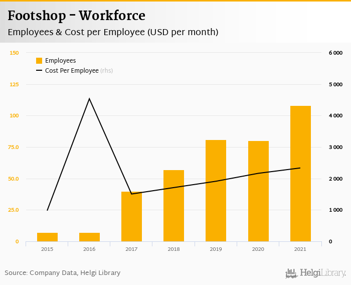 Footshop employed 108 employees in 2021, up 35% compared to the previous year. Historically, between 2015 and 2021, the firm's workforce hit a high of 108 employees in 2021 and a low of 7.00 employees in 2015.
