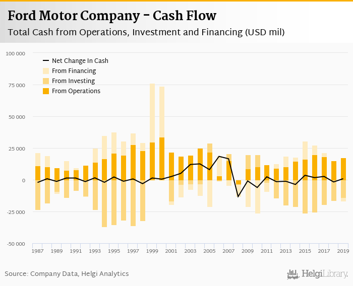 Ford Motor Company's operating cash flow stood at USD 17,639 mil in 2019, up 17.4% when compared to the previous year. Historically, between 1987 - 2019, the firm’s operating cash flow reached a high of USD 33,764 mil in 2000 and a low of USD -3,333 mil in 2008.