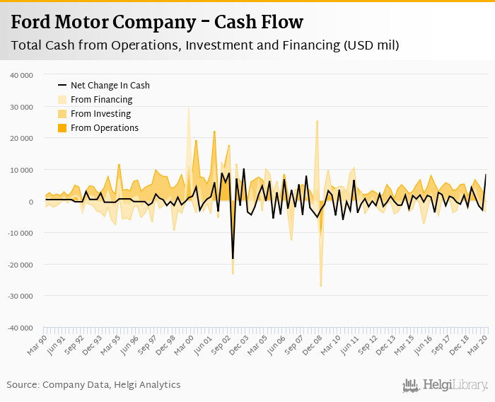 Ford Motor Company's operating cash flow stood at USD -473 mil in 1Q2020, down 113% when compared to the previous year. Historically, between 1Q1990 - 1Q2020, the firm’s operating cash flow reached a high of USD 21,987 mil in 3Q2001 and a low of USD -17,039 mil in 4Q2002.