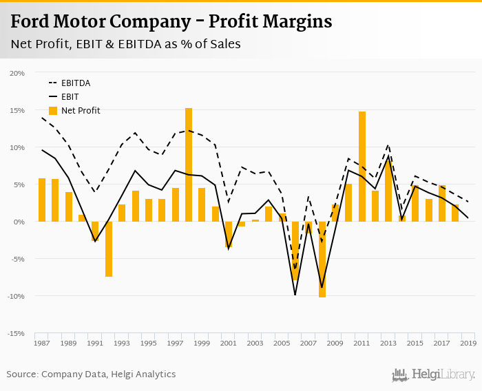 Ford Motor Company made a net profit of USD 47.0 mil with revenues of USD 155,900 mil in 2019, down by 98.7% and down by 2.77%, respectively, compared to the previous year.