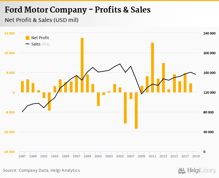 Ford Motor Company made a net profit of USD 47.0 mil in 2019, down 98.7% compared to the previous year. Total sales reached USD 155,900 mil, which is down 2.77% when compared to the previous year.