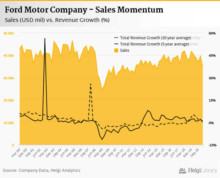 Ford Motor Company generated sales of USD 34,320 mil in 1Q2020, down 14.9% compared to the previous year. Historically, between 1Q1990 and 1Q2020, the company’s sales reached a high of USD 46,549 mil in 4Q2005 and a low of USD 4,410 mil in 4Q1997.