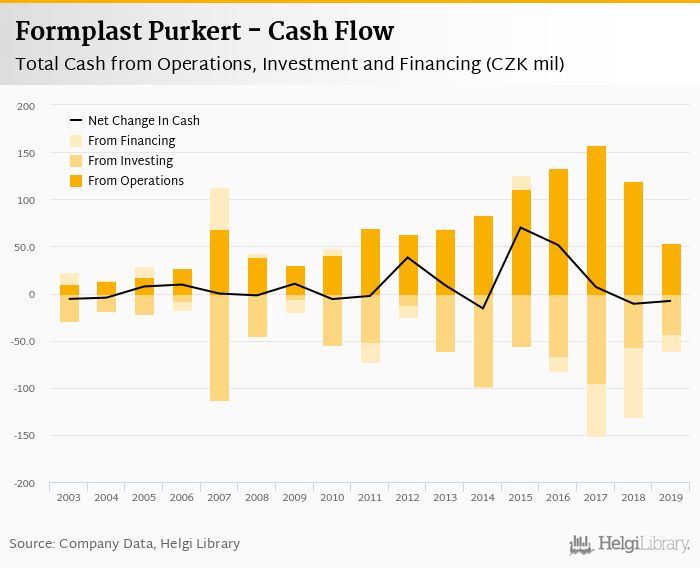 Formplast Purkert's operating cash flow stood at CZK 53.6 mil in 2019, down 55.2% when compared to the previous year. Historically, between 2003 - 2019, the firm’s operating cash flow reached a high of CZK 158 mil in 2017 and a low of CZK 10.6 mil in 2003.