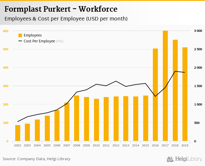 Formplast Purkert employed 511 employees in 2019, down 7.59% compared to the previous year. Historically, between 2002 and 2019, the firm's workforce hit a high of 600 employees in 2017 and a low of 87.0 employees in 2002.
