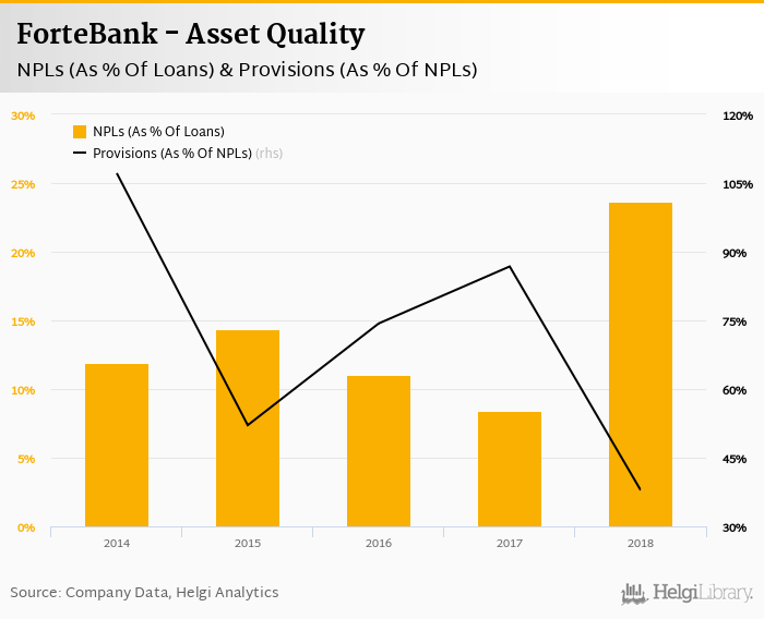 ForteBank's non-performing loans reached 23.7% of total loans at the end of 2018, up from 8.39% compared to the previous year. Historically, the NPL ratio hit an all time high of 23.7% in 2018 and an all time low of 8.39% in 2017.