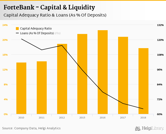 ForteBank's capital adequacy ratio reached 17.8% at the end of 2018, down from 20.8% compared to the previous year. Historically, the bank’s capital ratio hit an all time high of 22.6% in 2016 and an all time low of 13.9% in 2010.
