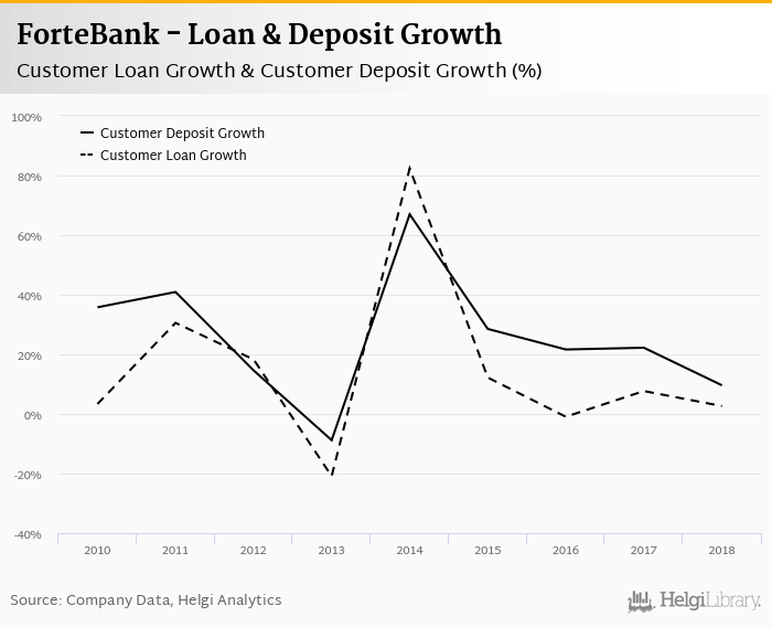 ForteBank's customer loan growth reached 2.65% in 2018, down from 7.68% compared to the previous year. Historically, the bank’s loans growth reached an all time high of 82.4% in 2014 and an all time low of -20.9% in 2013. In the last decade, the average annual loan growth amounted to 0%.