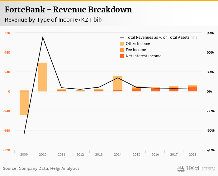 Historically, the bank’s revenues containing of interest, fee and other non-interest income reached an all time high of KZT 353 bil in 2010 and an all time low of KZT -278 bil in 2009. The average revenue in the last five years amounted to KZT 89.4 bil.