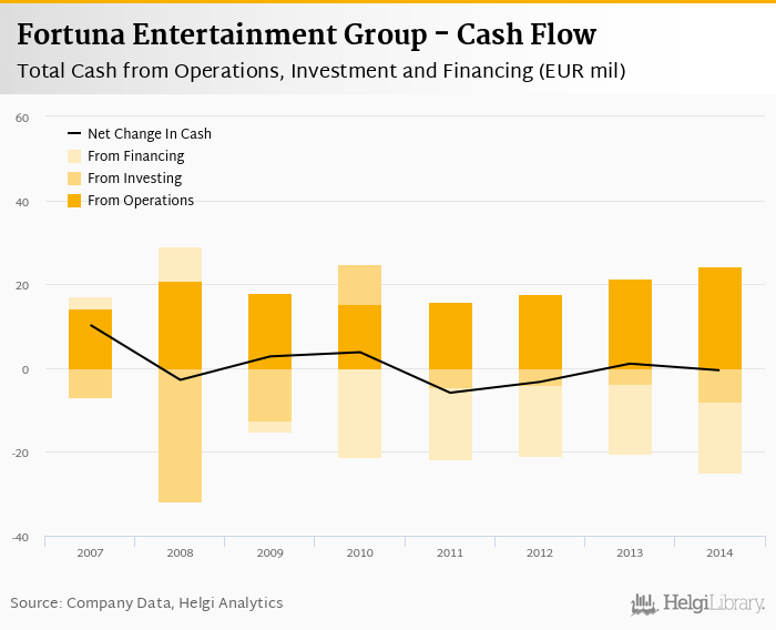 Fortuna Entertainment Group's operating cash flow stood at EUR 24.2 mil in 2014, up 13.6% when compared to the previous year. Historically, between 2007 - 2014, the firm’s operating cash flow reached a high of EUR 24.2 mil in 2014 and a low of EUR 14.2 mil in 2007.