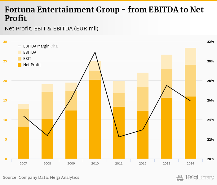 Fortuna Entertainment Group made a net profit of EUR 16.0 mil with revenues of EUR 110 mil in 2014, up by 2.34% and up by 12.9%, respectively, compared to the previous year. This translates into a net margin of 14.6%.
