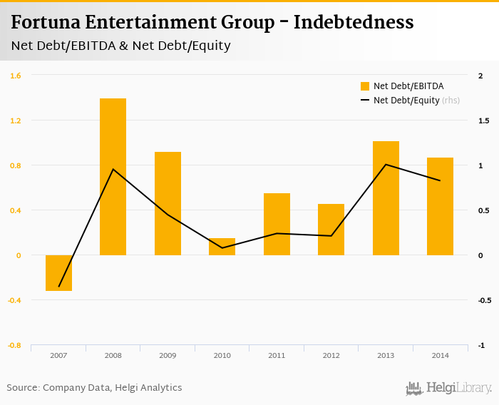 Fortuna Entertainment Group's net debt stood at EUR 24.7 mil and accounted for 0.821 of equity at the end of 2014. The ratio is down 0.181 pp compared to the previous year.
