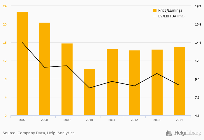 At the end of 2014, the firm traded at price to earnings of 15.0x. Over the last five years, this multiple achieved a high of 15.0x in 2014 and a low of 10.2x in 2010 with an average of 13.7x.