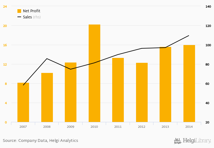 Sales have grown by 7.99% a year on average since 2009. They reached a high of EUR 110 mil in 2014 and a low of EUR 58.0 mil in 2007.