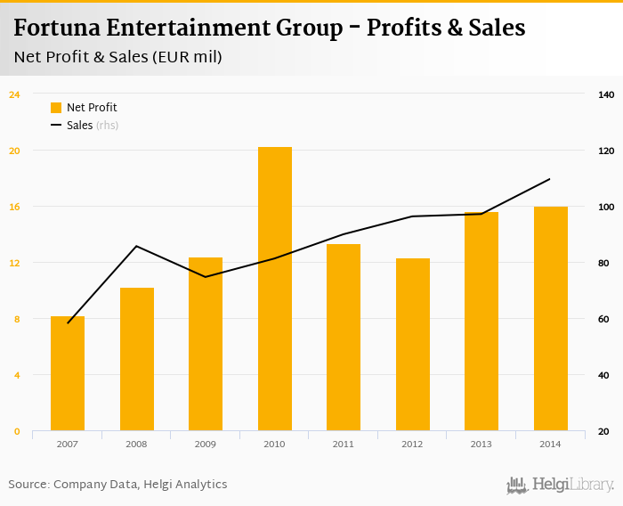 Fortuna Entertainment Group made a net profit of EUR 16.0 mil in 2014, up 2.34% compared to the previous year. Total sales reached EUR 110 mil, which is up 12.9% when compared to the previous year.