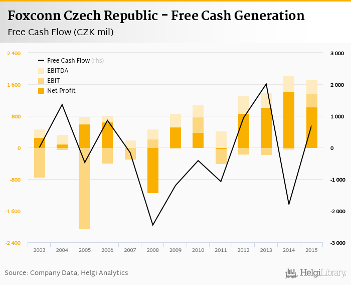 Foxconn Czech Republic made a net profit of CZK 1,032 mil with revenues of CZK 126,904 mil in 2015, down by 27.2% and up by 6.14%, respectively, compared to the previous year. This translates into a net margin of 0.813%.