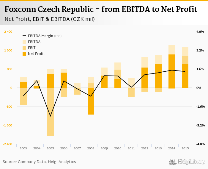 As far as Foxconn Czech Republic's peers are concerned, Varroc Lighting Systems Czech Republic posted net and EBITDA margin of 4.32% and 7.60%, respectively in 2015, Automotive Lighting generated margins of 9.57% and 12.9% and Continental Automotive Czech Republic profit margin reached 1.43% on the net and 12.9% on the EBITDA level in 2019.