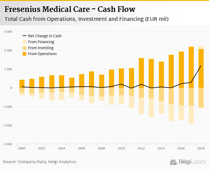Fresenius Medical Care's operating cash flow stood at EUR 2,062 mil in 2018, down 5.93% when compared to the previous year. Historically, between 1999 - 2018, the firm’s operating cash flow reached a high of EUR 2,192 mil in 2017 and a low of EUR 330 mil in 1999.
