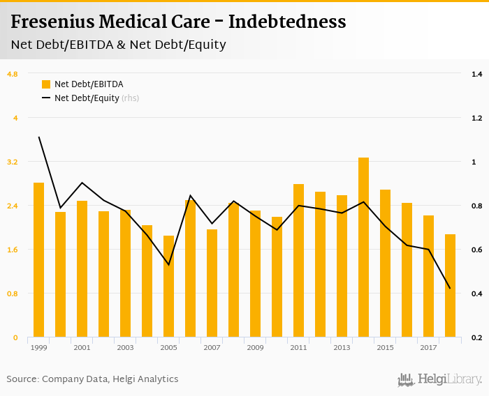 Fresenius Medical Care's net debt stood at EUR 5,401 mil and accounted for 0.419 of equity at the end of 2018. The ratio is down 0.179 pp compared to the previous year.