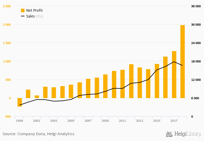 Historically, between 1999 and 2018, the company’s net profit reached a high of EUR 1,982 mil in 2018 and a low of EUR -234 mil in 1999. Over the last decade the firm's net profit increased by an average of 13.5% a year.