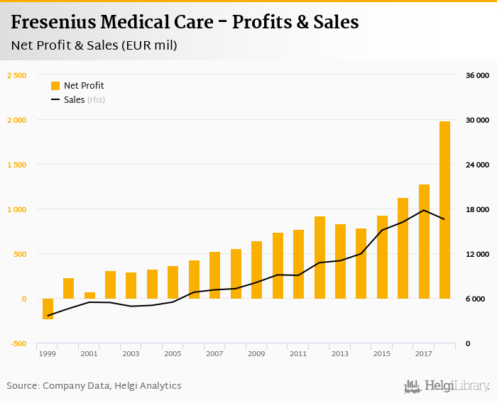 Fresenius Medical Care made a net profit of EUR 1,982 mil in 2018, up 54.9% compared to the previous year. Total sales reached EUR 16,547 mil, which is down 6.95% when compared to the previous year.