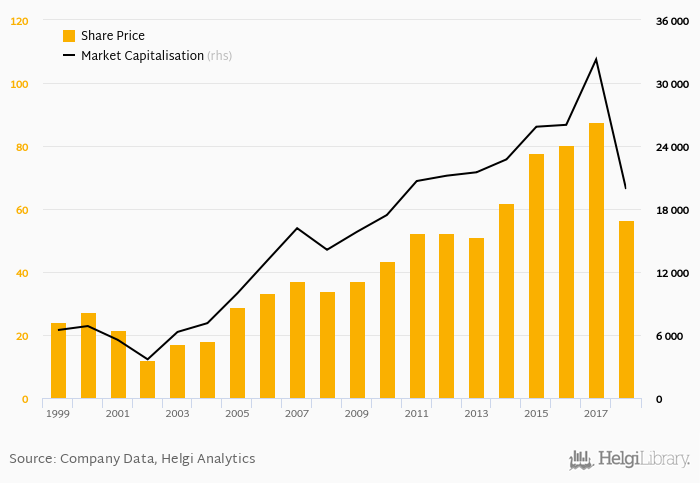 Since the end of 2013, stock has appreciated by 10.5% implying an annual average growth of 2.01% In absolute terms, the value of the company fell by USD 1,596 mil.