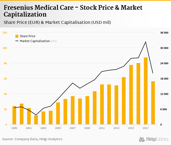 Fresenius Medical Care stock traded at EUR 56.6 per share at the end 2018 implying a market capitalization of USD 19,901 mil.