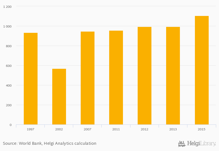 Historically, freshwater withdrawals per capita in Armenia reached an all time high of 1,105 cbm in 2015 and an all time low of 569 cbm in 2002.