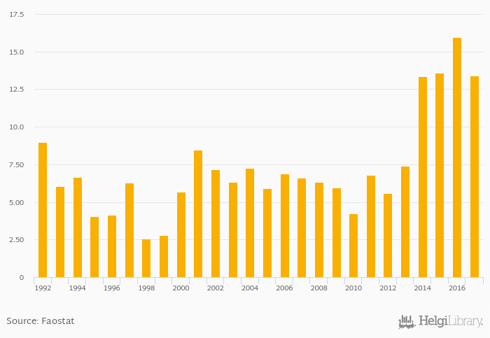 Fruit consumption per capita fell 16.2% to 13.2 kg in Kyrgyzstan in 2017, according to Faostat.