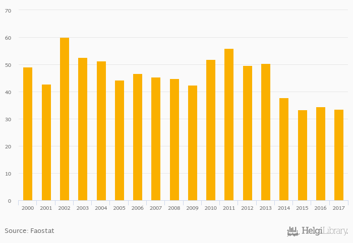 Fruit consumption per capita fell 2.40% to 33.5 kg in Luxembourg in 2017, according to Faostat.