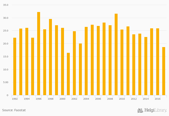 Fruit consumption per capita fell 27.5% to 17.8 kg in Macedonia in 2017, according to Faostat.