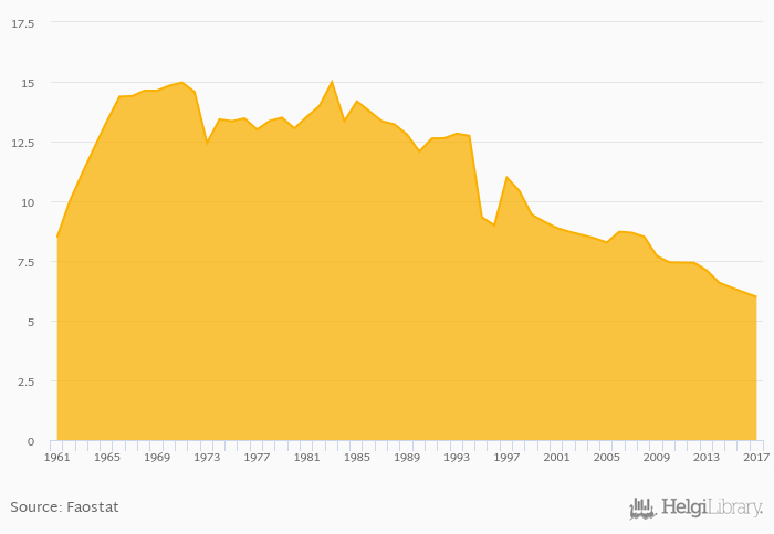 Fruit consumption per capita fell 3.00% to 6.04 kg in Chad in 2017, according to Faostat.