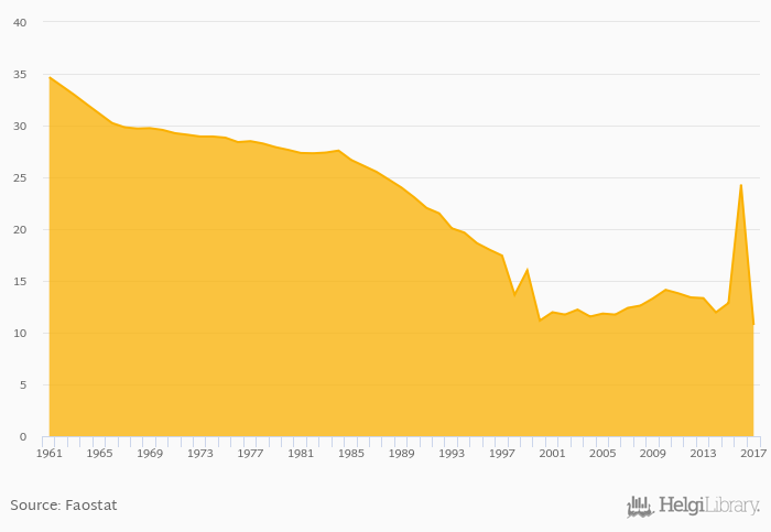 Fruit consumption per capita fell 55.8% to 10.7 kg in Benin in 2017, according to Faostat.