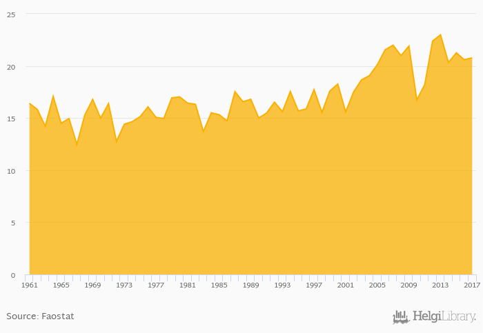Fruit consumption per capita rose 0.856% to 20.8 kg in the USA in 2017, according to Faostat.