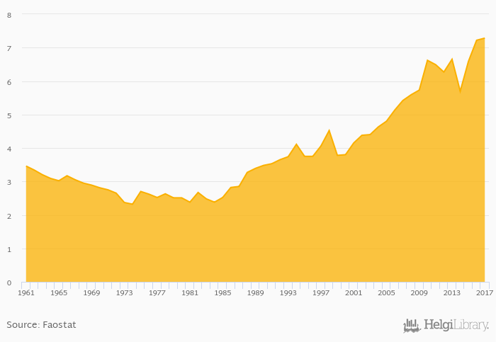 Fruit consumption per capita rose 0.938% to 7.33 kg in Ivory Coast in 2017, according to Faostat.