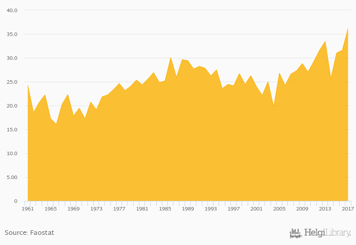 Historically, fruit consumption per capita in Turkey reached an all time high of 36.0 kg in 2017 and an all time low of 16.1 kg in 1966. When compared to Turkey's main peers, fruit consumption per capita in Bulgaria amounted to 26.1 kg, 41.1 kg in Greece, 16.9 kg in Iraq and 34.5 kg in Iran in 2017.