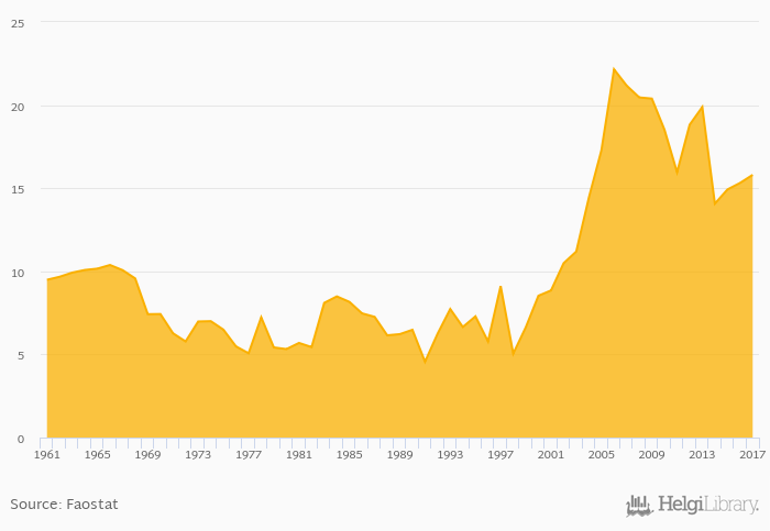 Fruit consumption per capita rose 3.21% to 16.1 kg in Honduras in 2017, according to Faostat.