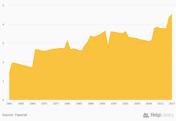 Fruit consumption per capita rose 3.55% to 4.51 kg in Central African Republic in 2017, according to Faostat.