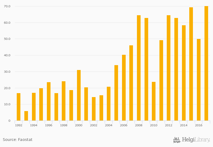Fruit consumption per capita rose 42.2% to 71.0 kg in Armenia in 2017, according to Faostat.